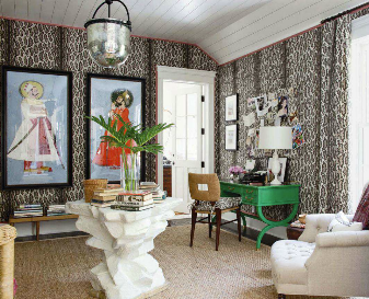 I love the tiled wall in the image below from AD. Lighting, mirrors, cabinet all seem to float on that tile.